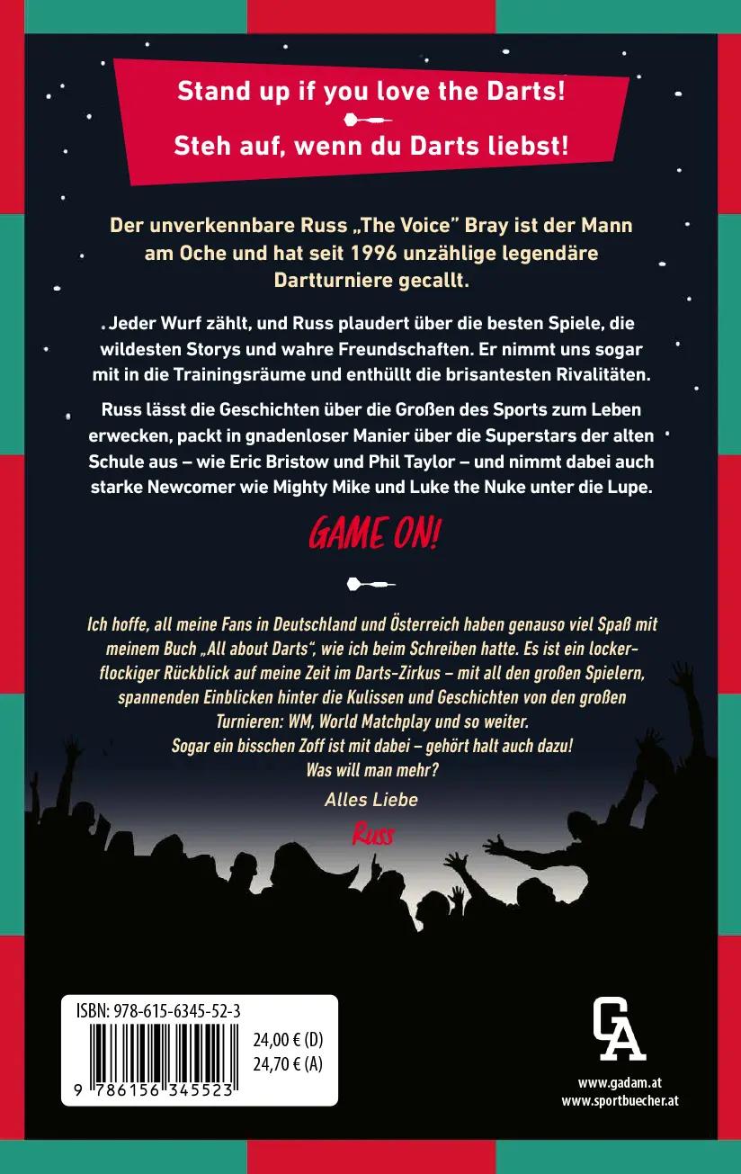 Russ lässt die Geschichten über die Großen des Sports zum Leben erwecken, packt in gnadenloser Manier über die Superstars der alten Schule aus – wie Eric Bristow und Phil Taylor – und nimmt dabei auch starke Newcomer wie Mighty Mike und Luke the Nuke unter die Lupe.